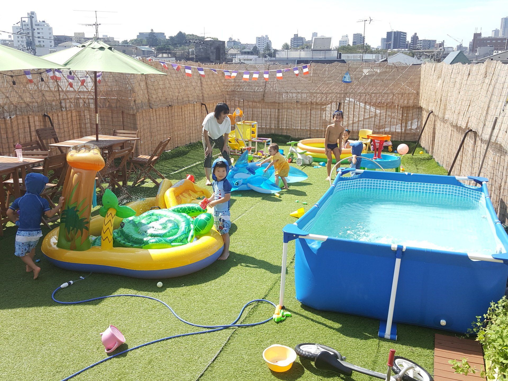 On Saturdays, Sundays & National Holidays at EIFJ (subject to the availability of our team in the language of instruction of your choice), students can take advantage of the school environment and equipment (teaching materials, library, educational games, swimming pools on the rooftop terrace in summer and autumn, other physical activity equipment in winter and spring), and of activity leaders’ teaching to discuss, study, improve their skills, and have fun: the program uses back some of the nursery, kindergarten or elementary accreditation candidate learning materials & themes of the past week. The language used is either English, French, Japanese, or a combination: our teachers adapt themselves to the wishes of families. A meal (prepared at home) is served to the students at lunchtime, a supervised nap is given to the little ones. Classes are created according to the age of the students and the language choice.