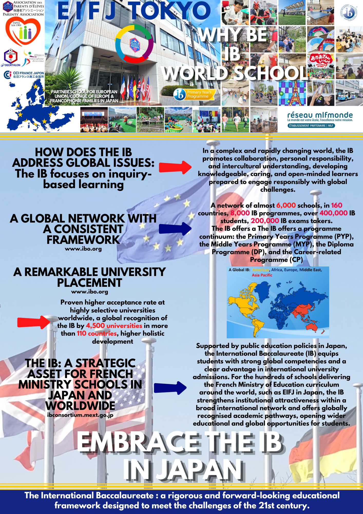 - Embracing a proven educational model implemented in accredited French international schools, EIFJ follows the curriculum of the French Ministry of National Education, and is an authorized IB Primary Years Programme (PYP) World School;